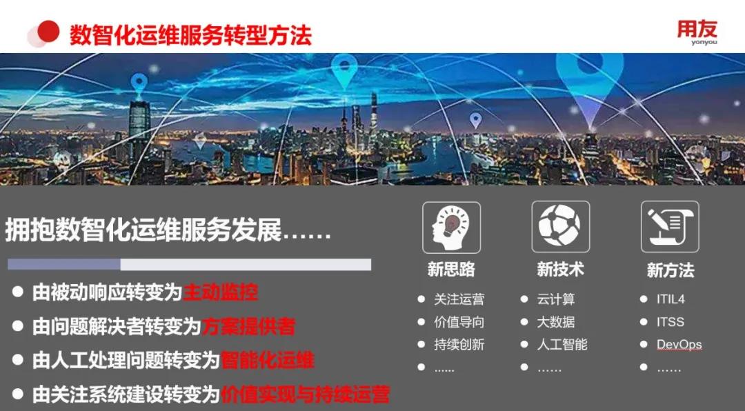 用友服务已进入数智运维时代,IT服务转型过程中充分考虑用户体验,以服务为导向,将繁琐的流程通过自动化、智能化的手段,采用敏捷的管理方式,赋能企业IT服务全面落地数字化服务运营转型,并将继续向“智服务、轻管理、敏沟通”赋能企业IT服务新价值,与用户朋友一起拥抱智能运维,开启数智服务!
