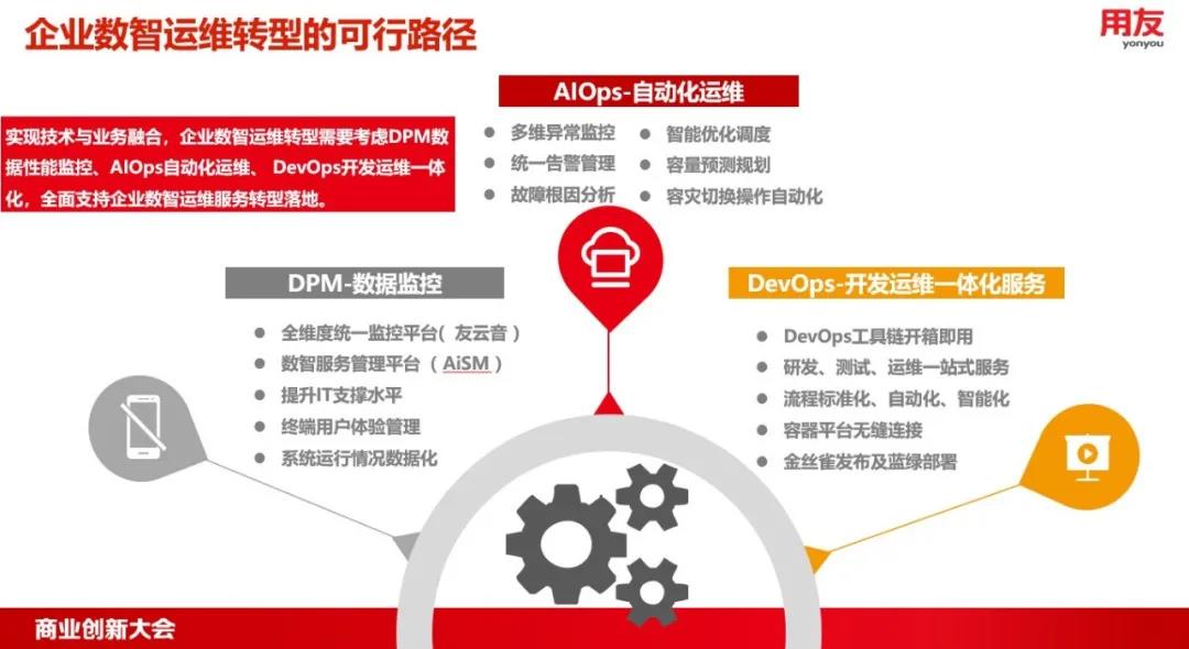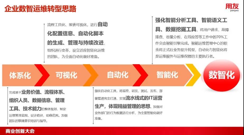 用友从思路、技术、方法三方面帮助客户成功数智运维转型成功,实现商业创新。用友公司高端服务事业部总经理赵永春先生提出,用友的服务要引领数智服务发展趋势
