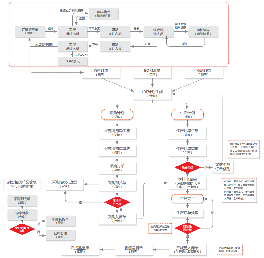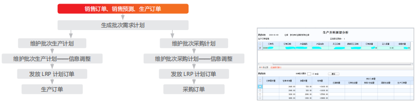 通过 U8+ 系统建立科学高效的计划管理平台,实现计划的快速准确下达。销售部门下达销售订单,计划调度部根据销售订单下达生 产订单,并运行LRP 计划,采购部门根据计划量进行物料采购处理,齐套分析,车间根据生产订单领料。