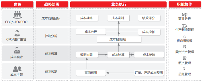 • 成本管理围绕生产订单及其对应领料及入库(投产完工)情况进行核算,通过定义合理的费用分摊标准实现成本的精细化管 理,精确分析产品单品成本、订单成本及各项成本构成等。